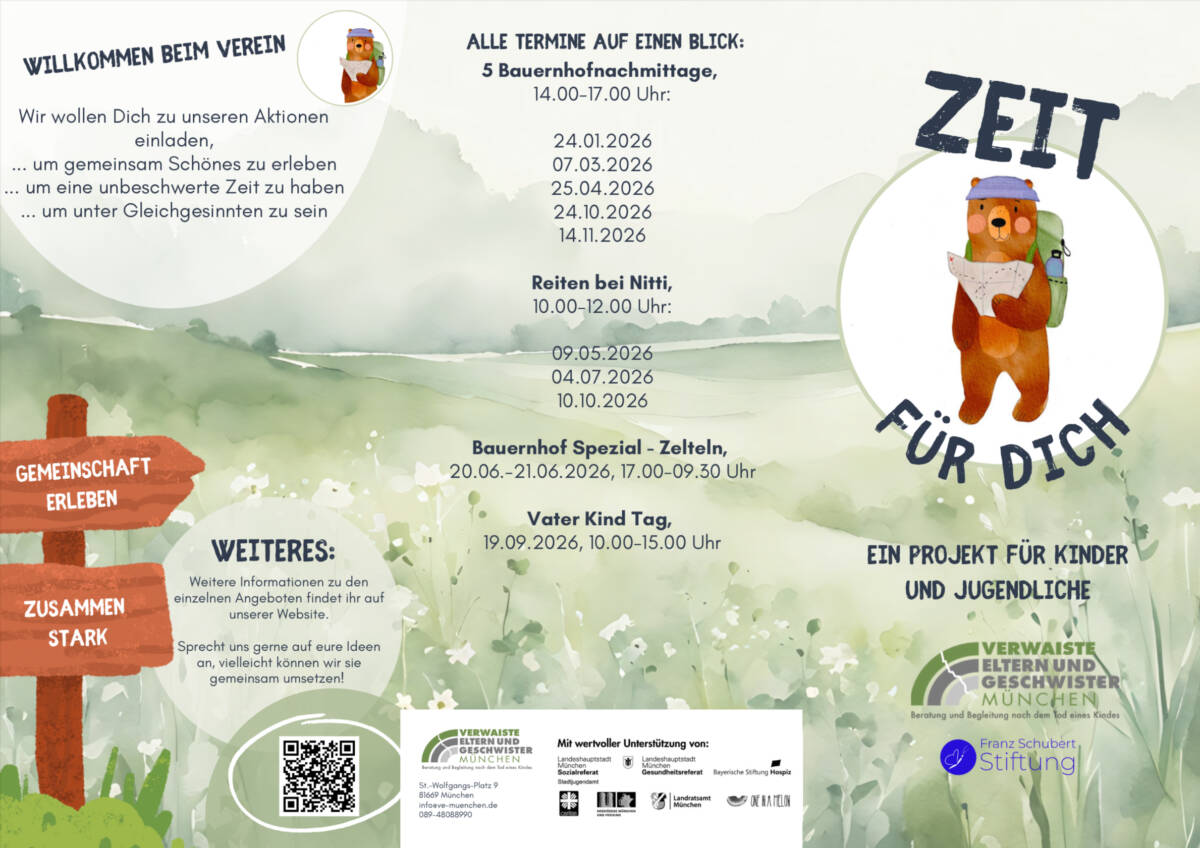 Bereits letzten April konnten wir im Rahmen einer Alpaka-Wanderung den Verein Verwaiste Eltern und trauernde Geschwister München e.V. bei Ihrem Projekt „Zeit für Dich“ mit 1.500€ unterstützen.